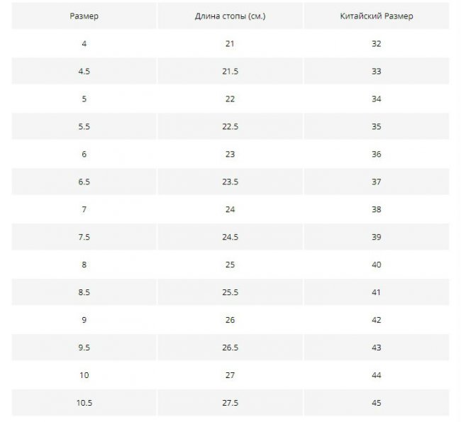 Китайские производители обычно указывают размеры обуви размерной сетке США. Выбирая размер, добавьте к реальной длине стопы 0,5 см, чтобы обувь не пережимала пальцы. После того как вы узнали длину стопы, то по таблице сможете легко определить, какой размер нужно заказать.