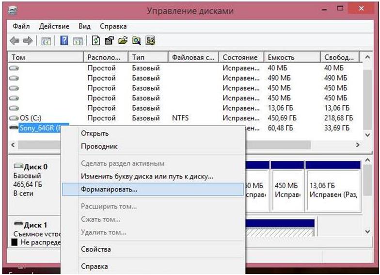 В открывшемся менеджере управления дисковым пространством необходимо найти флеш-карту, которую необходимо отформатировать. Наведите на нее курсор и правой кнопкой мыши — «Форматировать».