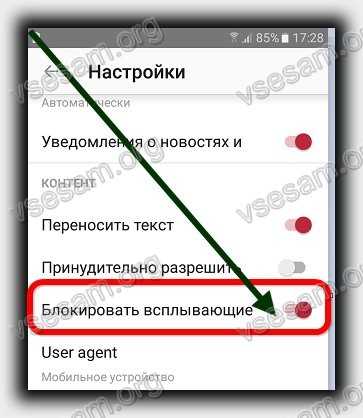 - Теперь вы увидите опцию настроек всплывающего окна, просто нажмите на нее и проведите пальцем, чтобы отключить ее.