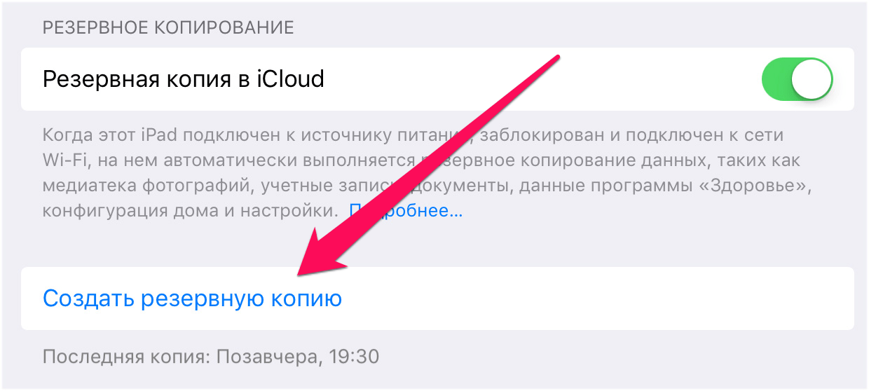 В самом низу окна будет указано время последней копии (если у вас включена функция бэкапа), если вы хотите создать свежую версию, нажмите кнопку «Создать копию».