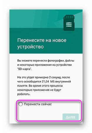 Чтобы сразу переместить данные на карту памяти, о и нажмите кнопку «Далее». Затем тапните по кнопке «Перенести».