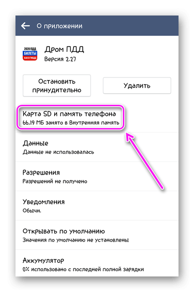 Как только вы окажетесь в диспетчере приложений, просто прокрутите и найдите любое приложение или игру, загруженную из магазина Google Play. Выберите приложение, коснитесь первой опции под названием «Хранилище», а в разделе, где установлено внутреннее хранилище, коснитесь большого значка, как показано ниже.