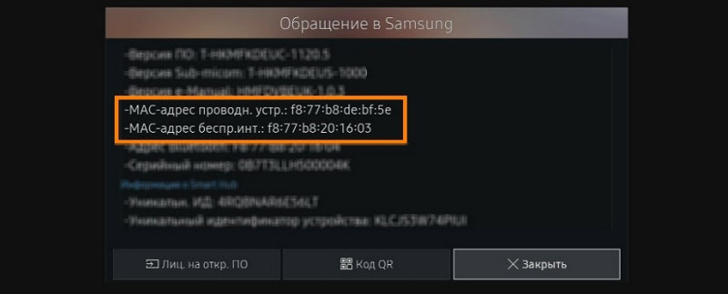 - Можно зайти в настройки телевизора, в раздел «Поддержка» – «Обращение в Samsung» (или «Об этом телевизоре») и прокрутив страницу вниз, мы увидим информацию о МАС-адресе. Там будет указан MAC-адрес проводного и беспроводного подключения.