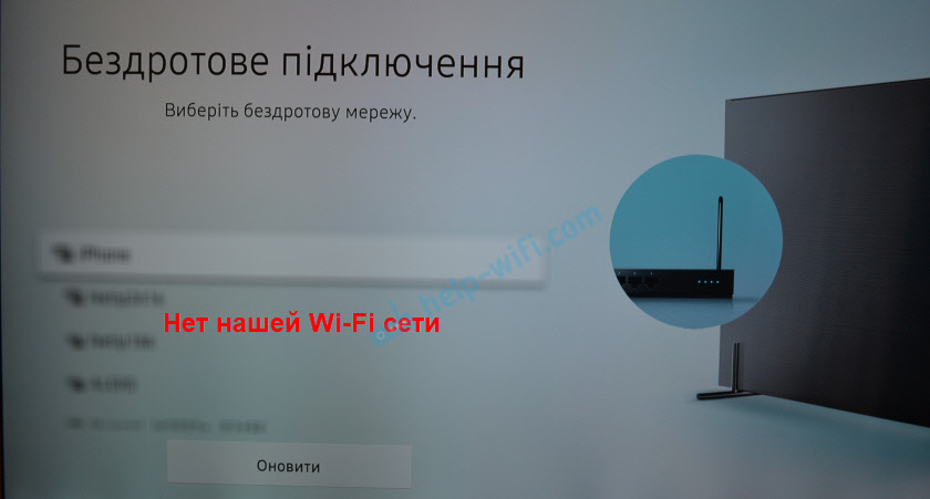 Чаще всего, конечно, в списке доступных сетей на телевизоре Samsung нет именно нашей беспроводной сети, к которой другие устройства подключены и отлично работают. Если телевизор не находит ни одну сеть (но они отображаются на других устройствах) то скорее всего это аппаратная проблема с телевизором, или в нем вообще нет беспроводного модуля. Вернемся к проблеме, когда в списке нет одной, нужной нам сети.