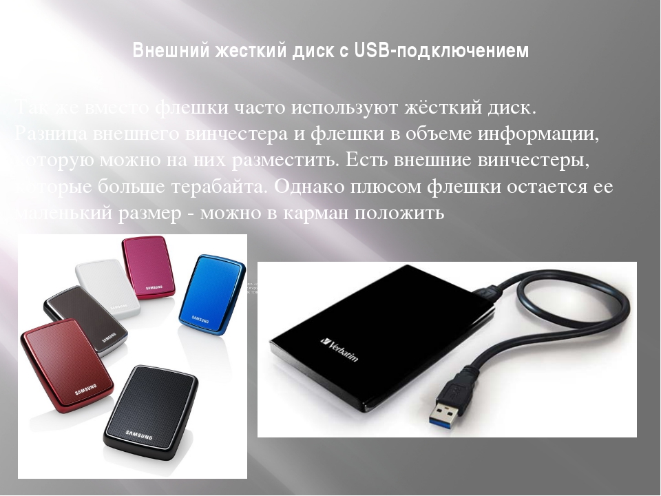 Внешние диски, особенно модели жестких дисков, в основном используются для компьютеров, но это не единственное их назначение. Такой накопитель можно использовать также с телевизором, игровой приставкой или смартфоном.