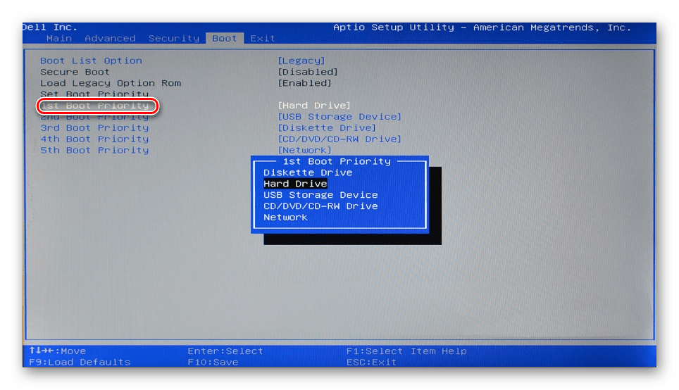 Там есть параметры First Boot Device – вот зайдите в этот параметр и выберите там свой CD-DVD-привод, если грузитесь с загрузочного диска типа CD или DVD. Если же грузитесь через флешку, то в First Boot Device ничего менять не надо. А нас интересует пункт Hard drive priority. Вот тут и нужно на первое место установить Вашу флешку. Далее нужно сохранить настройки в Биосе. И перезагрузить компьютер.