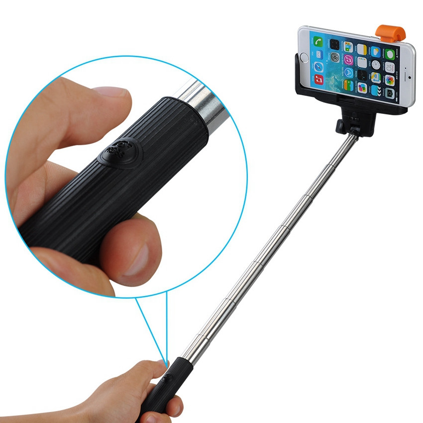 - Монопод, в котором кабель с одной стороны встроен в него, а с другой стороны вставляется в разъем для наушников на смартфоне. На рукоятке монопода находится кнопка, с помощью которой делаются фото.