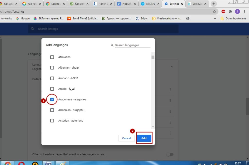 - Тут вы сможете выбрать необходимый язык или добавить его, если в списке Гугл Хрома его нет.