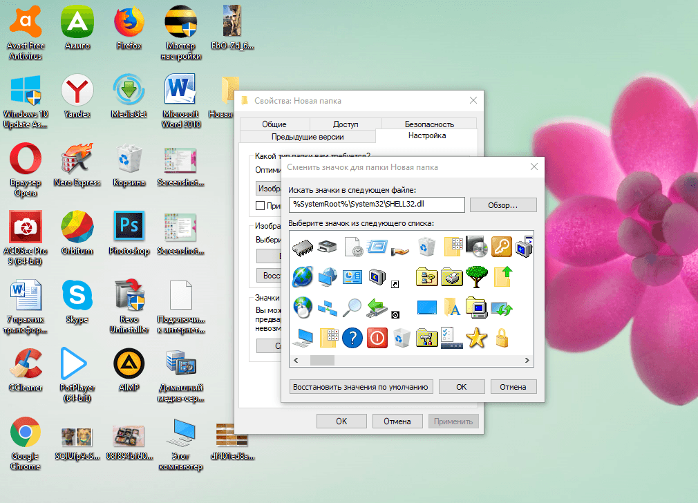Вы можете выбрать значок из стандартных (значки по умолчанию находятся в файлах C:\Windows\System32\imageres.dll и C:\Windows\System32\shell32.dll) или нажмите “Обзор” и найдите нужный значок в любой другой папке.