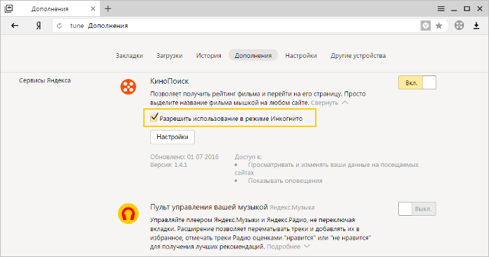 - Сделайте активным пункт “Разрешить использование в режиме Инкогнито”.