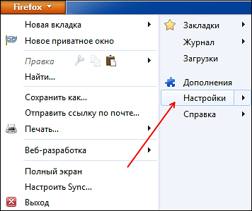Для того чтобы сделать Mozilla Firefox браузером по умолчанию нажимаем на кнопку «Firefox», которая находится в верхнем левом углу программы, и в открывшемся окне выбираем пункт «Настрйоки».