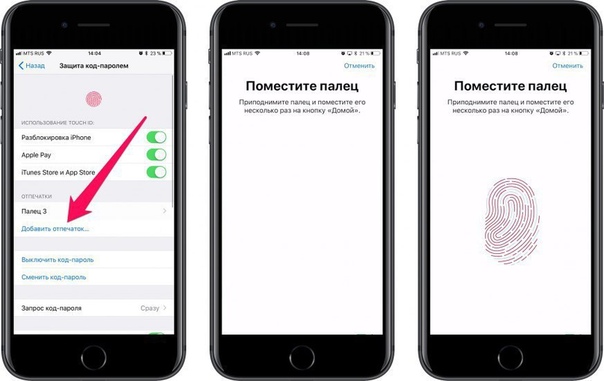 Для устройств с Touch ID: прикоснитесь пальцем к сканеру, чтобы идентифицировать его в списке Отпечатки пальцев . Коснитесь существующего отпечатка пальца, чтобы удалить его, проведите по одному из них, чтобы удалить его, или коснитесь Добавить отпечаток для установки нового (можно до пяти).