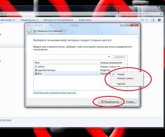 Теперь можете добавить нового пользователя, если его нет в списке: введите имя в пустое поле и нажмите «Добавить». Затем выделяем нужного пользователя из списка и выбираем для него «Уровень разрешений». Сделаем, чтобы все подключенные к сети пользователи могли просматривать и редактировать файлы в папке: выбираем «Чтение и запись». Нажмите кнопочку «Общий доступ».