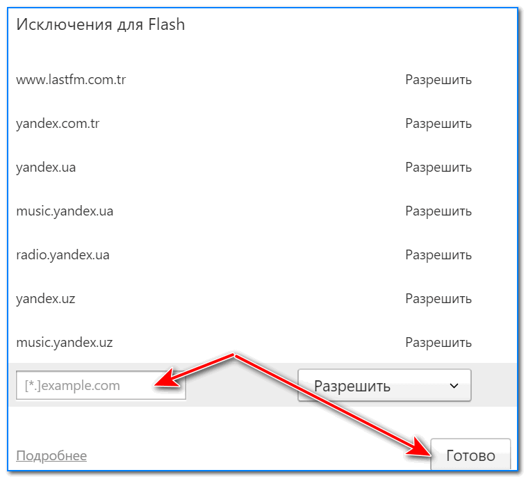 Пункты “Блокировать” и “Разрешить” позволяют добавить список сайтов, где по умолчанию будет заблокировано Flash содержимое или же, напротив, включено – соответственно. Просто воспользуйтесь кнопкой “Добавить” в блоке “Разрешить” и введите адреса сайтов, которым вы доверяете.