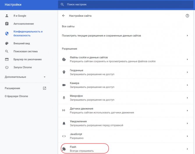 Для настройки доступны три опции. Первая из них звучит как “Блокировать Flash на сайтах” и по умолчанию блокирует содержимое. Если ползунок справа передвинуть в сторону, то значение поменяется на “Всегда спрашивать”, что позволит при необходимости включать флеш-содержимое через контекстное меню.