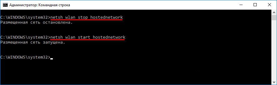 — netsh wlan start hostednetwork — для запуска точки доступа