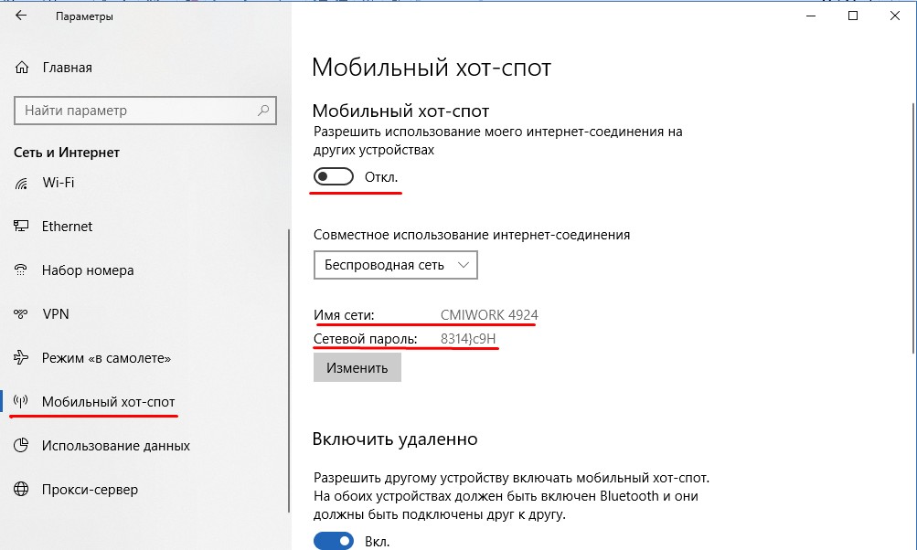 Пуск – Параметры (шестеренка) – Сеть и интернет – Мобильный хот спот