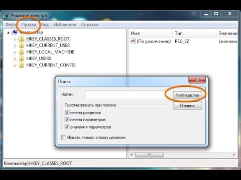 Шаг 3. Нажать «Найти следующее» («Find Next») для начала поиска. Необходимо, чтобы в меню поиска были отмечены галочками «Ключи» («Keys»), «Значения» («Values») и «Данные» («Data»).