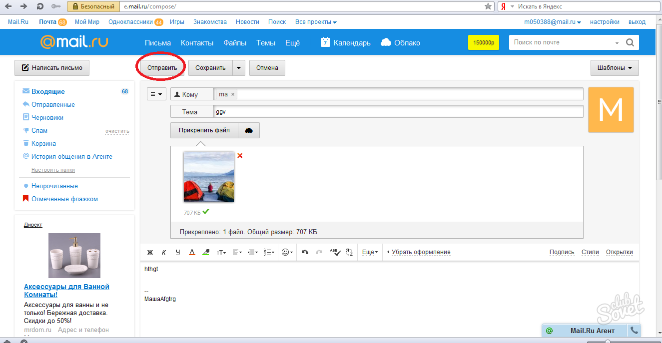 После этого сообщение с вложением уходит по указанному адресу. В ящике остается копия – она попадаем в папку «Отправленные».