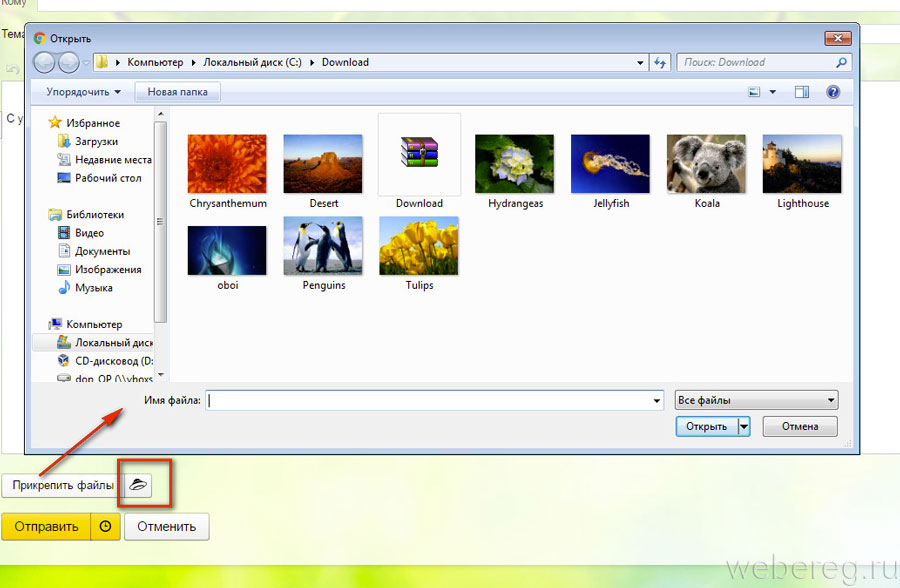 Выбранный способ позволяет отправлять фото картинки или скриншоты, сохраненные на компьютере пользователя. В открывшемся окне Проводника выбираем директорию, в которой храним изображения. Выделяем фотографию, которую хотим вложить в письмо. Щелкаем по обозначенной тройкой кнопке.