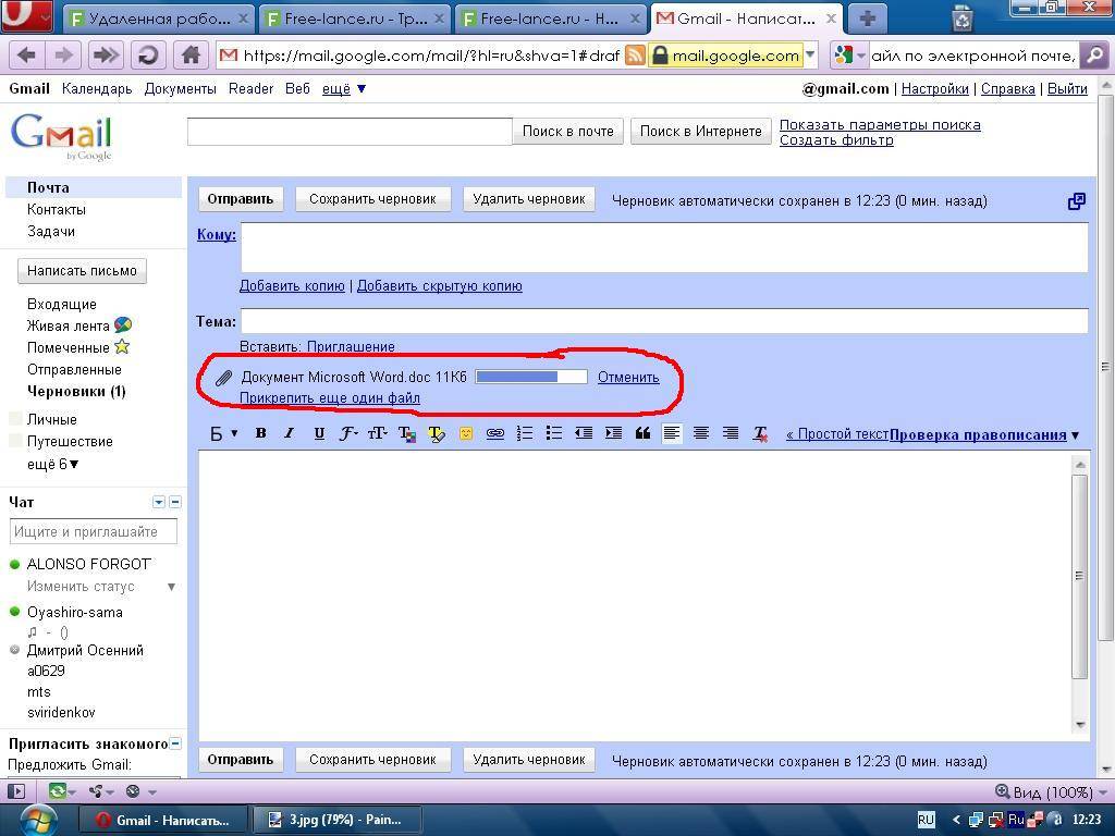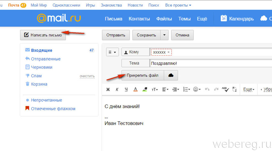 - Отправьте сообщение с прикрепленным файлом на свой же ящик. Для этого в поле «Кому» напечатайте адрес своей электронной почты.