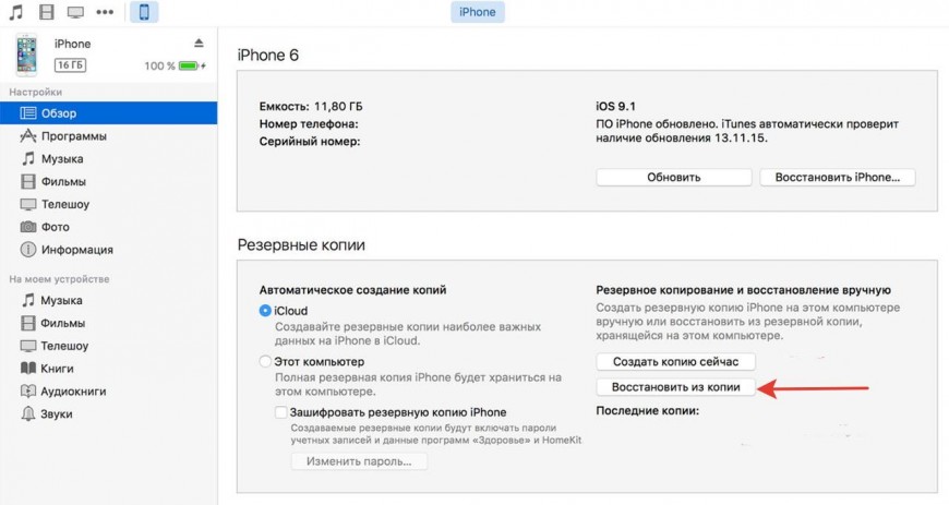 Действия по восстановлению фотографий из iTunes: