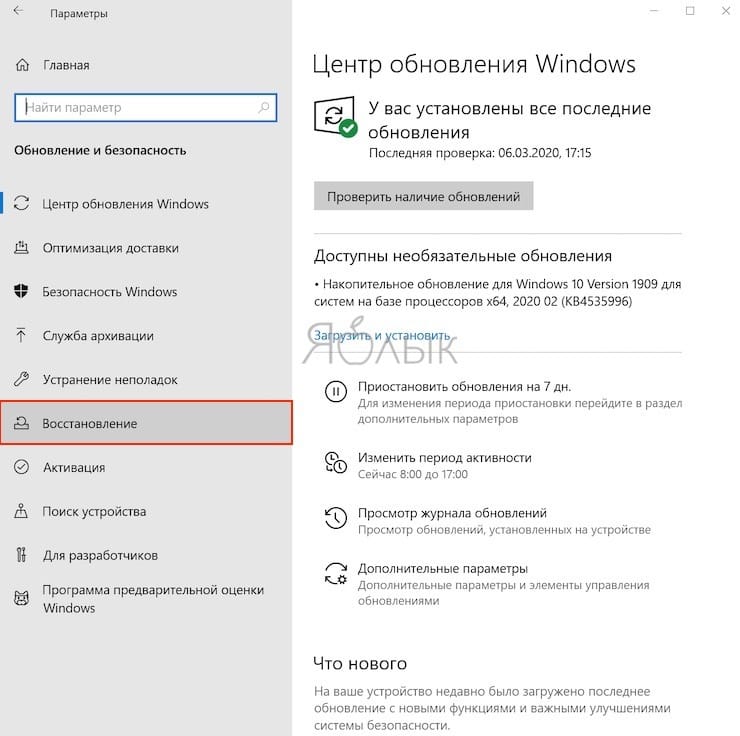 В левой панели этого раздела можно увидеть список доступных функций. Нам понадобится «Восстановление».