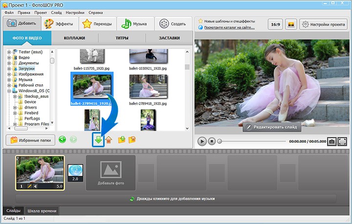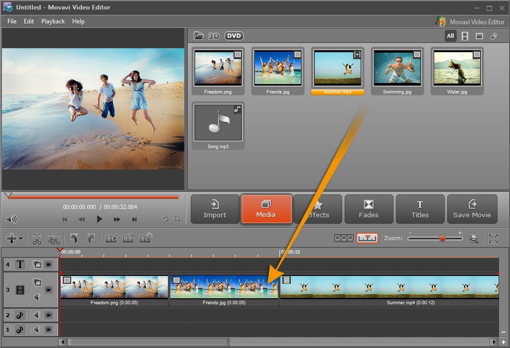Запустите видеоредактор и выберите режим «Новый проект». Загрузите составляющие будущего клипа. В центральном окне выделите нужный клип и перетащите на таймлайн.