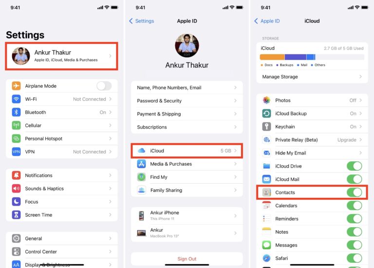 Первый из них — сервис iCloud. Перейдите в настройки айфона, нажмите на имя пользователя (в самом верху), а затем – на iCloud. После этого найдите строчку «Контакты» и включите её (ползунок станет активным).
