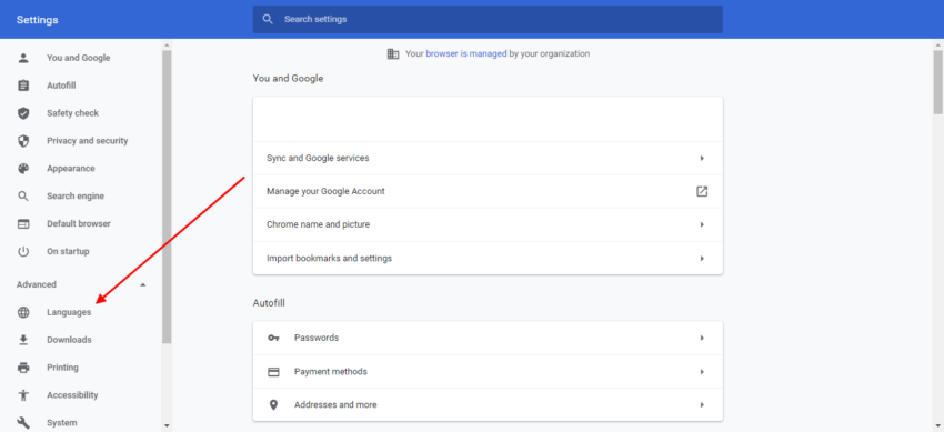 В открывшемся разделе прокрутите вниз до раздела «Языки». Вы можете настроить язык Chrome, используя первый вариант. Просто нажмите на « Язык. »