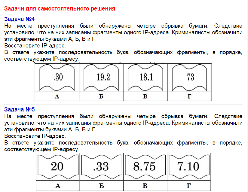 Петя записал IP-адрес школьного сервера на листке бумаги и положил его в карман куртки. Петина мама случайно постирала куртку вместе с запиской. После стирки Петя обнаружил в кармане четыре обрывка с фрагментами IP-адреса. Эти