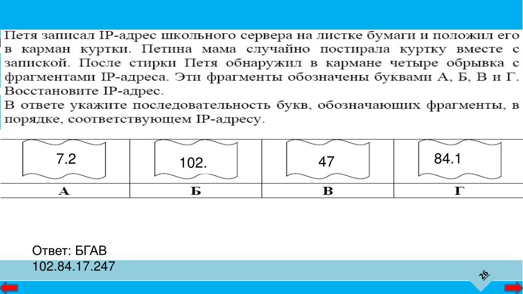 фрагменты обозначены буквами А, Б, В и Г. Восстановите IP-адрес. В ответе укажите последовательность букв, обозначающих фрагменты, в порядке, соответствующем IP-адресу.