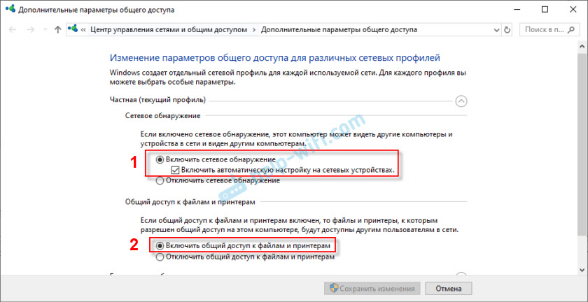 - Активируйте сетевое обнаружение и общий доступ к хранилищу, принтерам, сохраните правки.