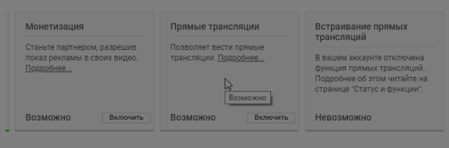 Откроется новое окно. В меню слева выбираем «Канал» и ищем «Прямые трансляции». Кликаем «Включить».