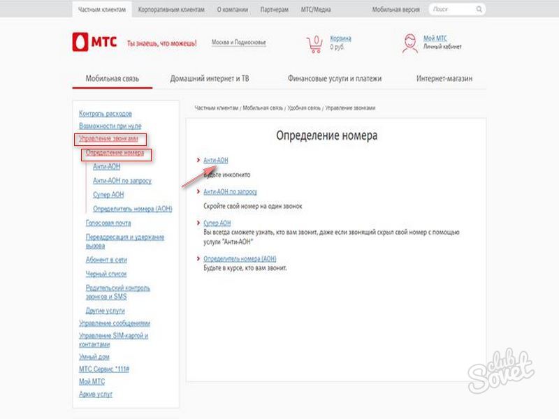 - Выбрать услугу «Антиопределитель номера» и произвести ее активацию