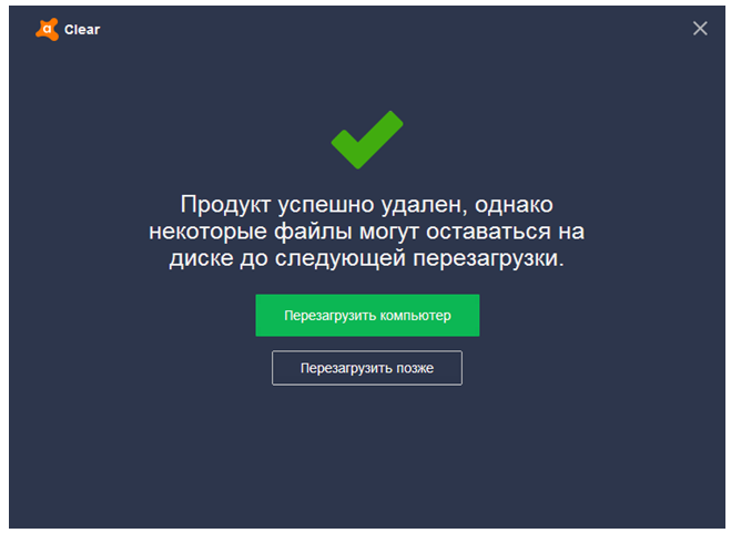 По завершении процесса появится сообщение об успешном удалении антивируса Avast с предложением перезагрузить компьютер.
