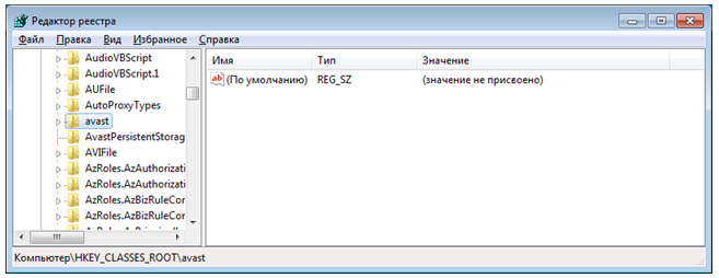 - Идём в редактор реестра, и проводим манипуляции, описанные в начале статьи, удаляем все записи, содержащие имя Аваст.