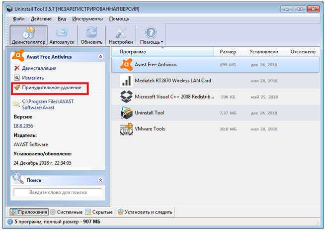 Использование стороннего софта позволяет не только убрать сам антивирус, но и удалить папку Аваст, которая иногда не удаляется, как ни пробуй. Хороший вариант – Uninstall Toll и его режим принудительного удаления.