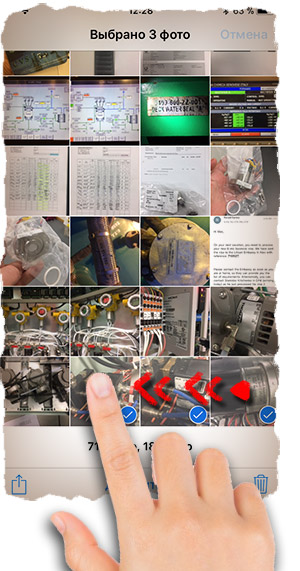 ШАГ 2 — Ставим палец на ПОСЛЕДНЮЮ фотографию в Фотопленке и не отпуская его сдвигаем влево (не вверх, а влево!!!), таким образом выделяя несколько фотографий одновременно.