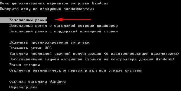 - Для того, чтобы загрузить операционную систему в безопасном режиме, перезагрузите компьютер и практически в самом начале его загрузки несколько раз нажмите на клавиатуре клавишу «F8». Перед Вами отобразится список способов загрузки Windows. С помощью стрелочек выберите строку «Безопасный режим» и нажмите «Enter» для продолжения.