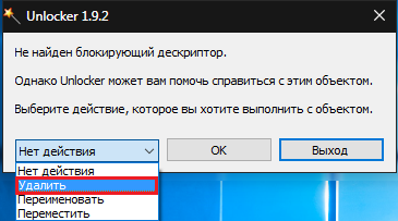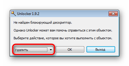 - Если блокирующих процессов найдено не было, то сразу выберите действие для файла «Удалить» и нажмите «ОК».