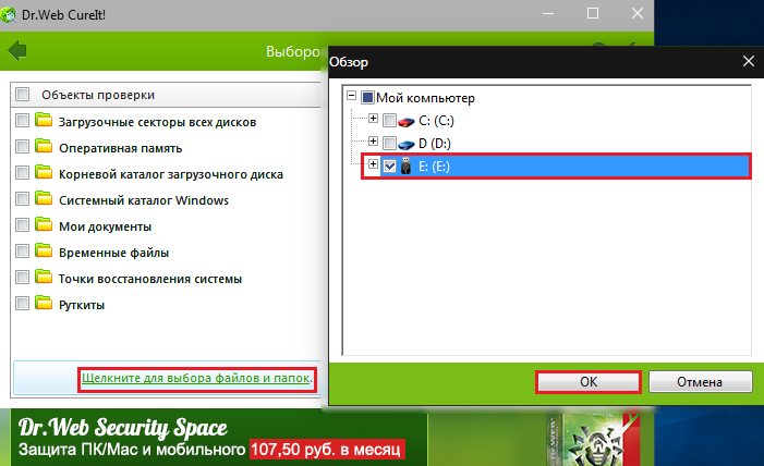 - Для того, чтобы не проводить полную проверку системного диска компьютера, в открывшемся окне кликните по ссылке «Щелкните для выбора файлов и папок», после чего отметьте маркером свою флешку или директорию с файлом и нажмите «ОК».
