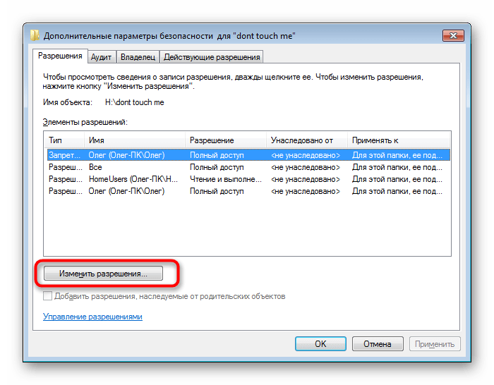 - Щелкните на «Изменить разрешения».