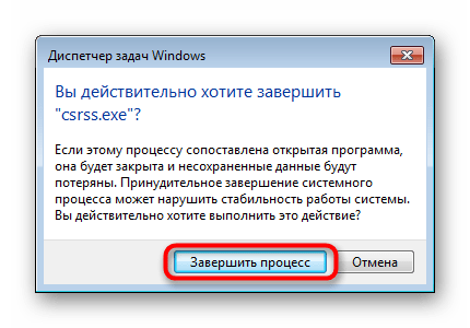 Ранее мы уже говорили о том, что удаление не завершится успешно тогда, когда файлы в папке используются какой-либо программой. Об этом уведомит появившееся на экране предупреждение, где и будет отображаться название процесса. Его понадобится завершить вручную, если вы уверены в том, что с объектами не происходят другие важные или системные действия. Сделать это можно через стандартный «Диспетчер задач».