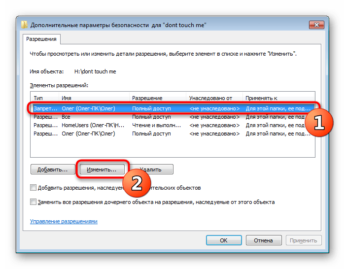 - Выделите ЛКМ того пользователя, с которого пытались удалить директорию, и посмотрите на его разрешения. Если все галочки стоят возле «Запретить», потребуется производить изменения.