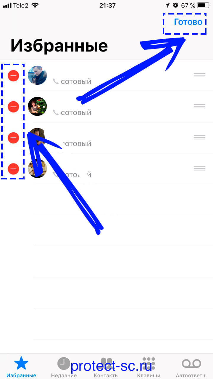 Шаг 3. После того, как Вы нажали «Изменить», слева от иконок контактов появятся знаки «минусовки». Нажмите на каждый из них для удаления контактов из списка избранного. Не забудьте сохранить правки, нажав на кнопку «Готово».