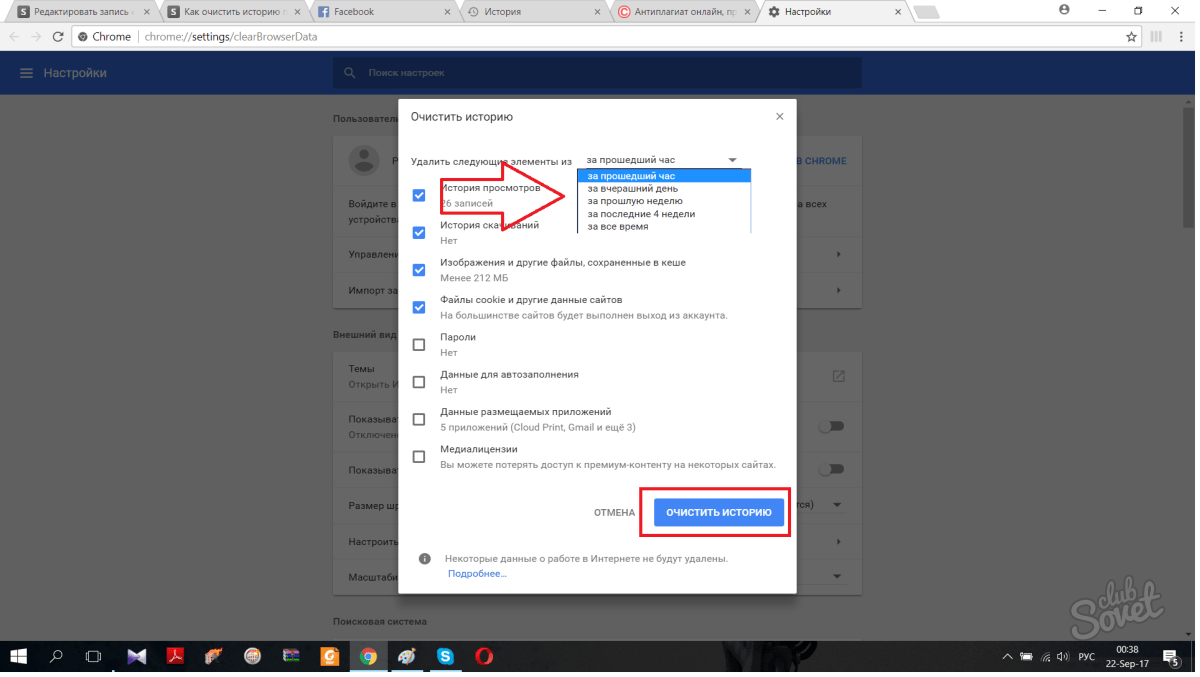- Используйте флажки для выбора того, какая информация будет очищена из вашего журнала. Ваши предпочтения описаны в разделе Что включено в мою историю? выше.