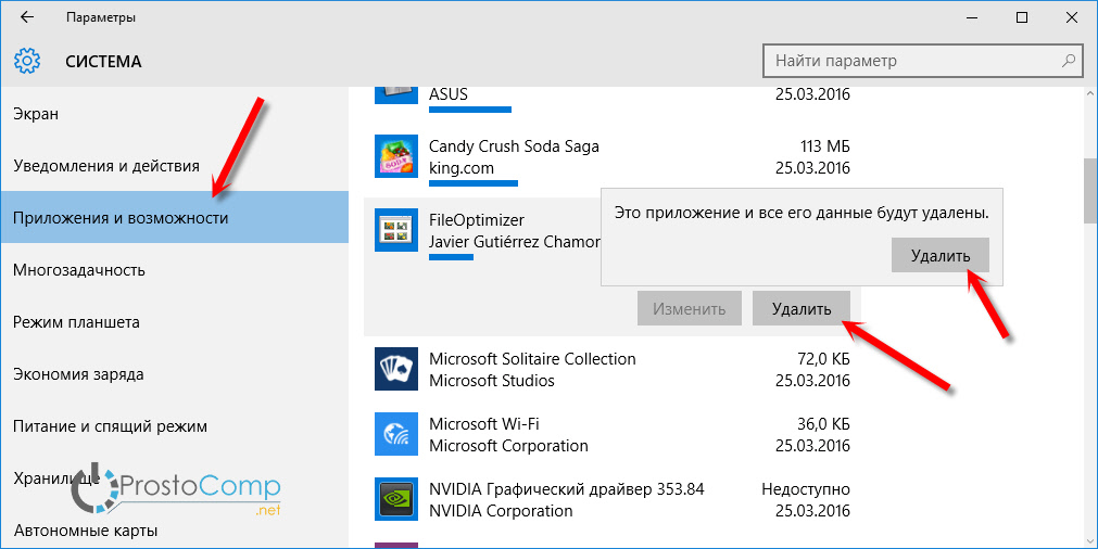 Параметры –> Система –> Приложения и возможности –> нажатие ПКМ по ненужному ПО –> Удалить
