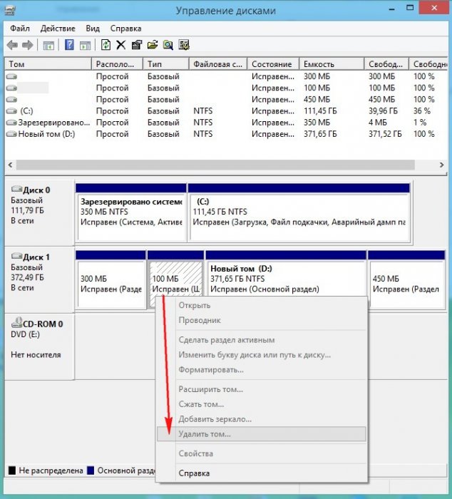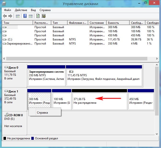 Купил мой приятель компьютер с твердотельным накопителем (объём 120 ГБ) вместо жёсткого диска, на простой винчестер элементарно не хватило денег (все знаем, что цены на комплектующие сейчас поднялись). Наш общий знакомый решил его выручить и предложил ему на время для хранения файлов не совсем старый жёсткий диск SATA II объёмом 400 ГБ. Вместе они подсоединили жёсткий диск к компьютеру, вошли в Управление дисками и увидели, что на диске имеется четыре раздела и из всех четырёх нормально удаляется только один. Дело в том, что на этом жёстком диске была раньше установлена заводская Windows 8.1 со всеми служебными разделами. Если щёлкнуть на первом, втором и последнем разделе правой мышью, то из всех вариантов будет предложена только «Справка»