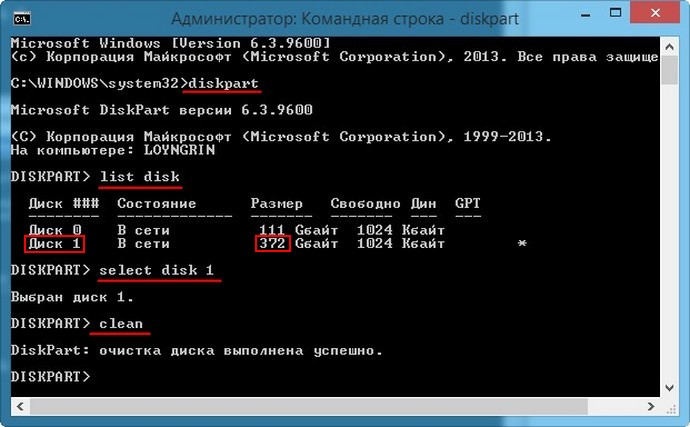 Выбираем для удаления всех разделов Диск 1 (372 Gбайт), вводим команду select disk 1. (Осторожно! В вашем случае цифра в команде может быть другой).